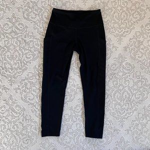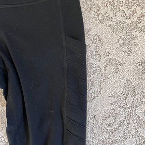 - Elasticized banded waist - Pull-on style - Side pockets - Fitted leg - Solid color - Stretch knit construction - Moto stitching - Anti-chafe, four-way stretch fabric - Moisture-wicking - Cropped - Approx. 8.5" rise, 24.5" inseam (size S); Natural waist is approximately 12 inches, but will stretch to approximately 14 inches.