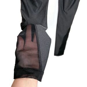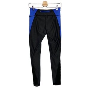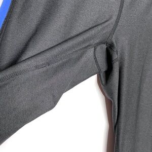 Z By Zella Side Striped Mesh Exercise Leggings. Size medium. Has some light pilling along seams and some loose threads (but no hole) at the rear end seam. Dark gray/black with cobalt blue striped at sides. Zippered media pocket at back waistband. Open black mesh at bottom back legs.