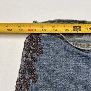 Stylish blue jeans with intricate brown embroidery. Flared leg design.