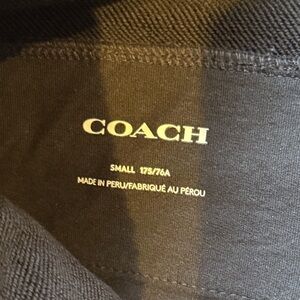 Stylish black joggers by Coach. Features gray side stripes with logo details. Comfortable fit with drawstring waist.