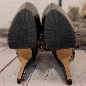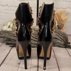 This sexy ankle boot features a rich leather upper highlighted by 3 bold gold chains draped across the front and a mesh sock for easy slip-on and a comfortable fit. A 6" stiletto heel and a 2" platform add lift.
