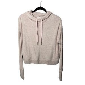 Kacey Feather Hoodie from Z Supply in Silver Pink, a light blush pink shade with subtle silver undertones. Super cute and cozy, great for layering. Pullover hooded sweatshirt with fuzzy, feathery texture fabrication, see video for fabric detail. Funnel neck with drawstring hood. Long sleeves and extended cuffs with thumb-hole detail. Ribbed hems.