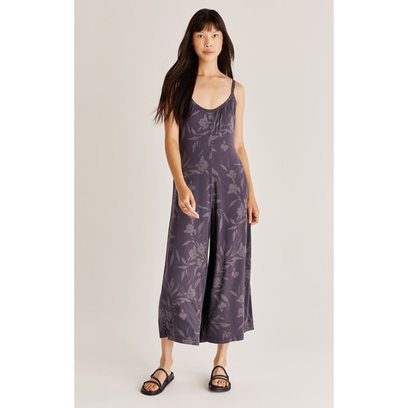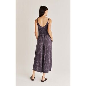 Effortless and comfy, this Z SUPPLY women's jumpsuit in size Small features a tonal purple floral print with a cropped wide-leg silhouette and soft stretch knit fabric. It has adjustable spaghetti straps, a flattering gathered bust, low scoop back with smocked elastic for fit, and convenient side pockets. Style it with sandals for casual wear or layer with a jacket for easy transitions.
