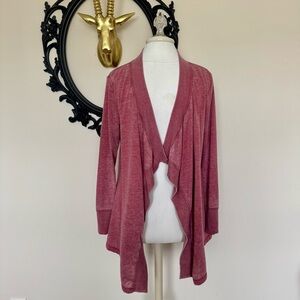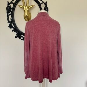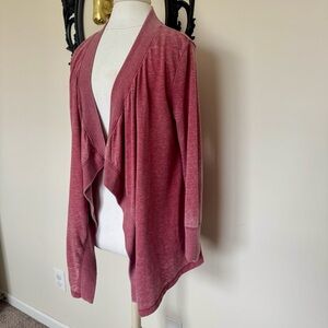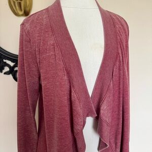 Chic and comfortable open front cardigan. Ideal for layering. It’s a burnout burgundy color (I would not recommend putting it in the dryer). It’s soft. It’s Z Supply. It’s a size small. Sleeves are tight while the body is loose.