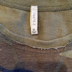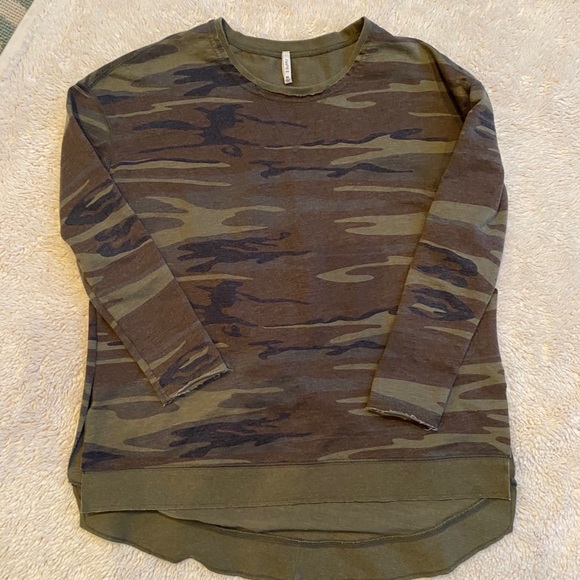 Your favorite pullover camo print. Crafted from baby French terry burnout fabric, this pullover features an allover camo print, exaggerated side slits, neckline triangle stitch, and a high-low hem.