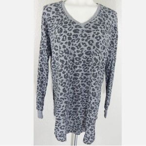 Item: Women's Gray Leopard Print Oversized Split Side V-Neck Waffle Knit Thermal Tee