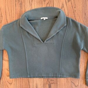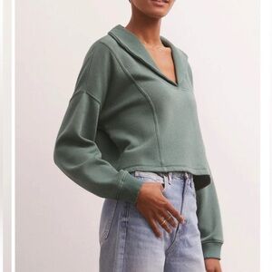 Good condition. Hardly worn. Z Supply Modern V-Neck Weekender sweatshirt in a botanical green color. This sweatshirt is made of a soft fleece material and features a wide v-neck collar, long sleeves, and a cropped length.