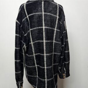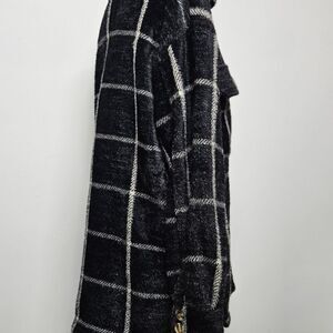 Stylish plaid button-up jacket with large pockets. Features a classic black and white pattern with gold buttons.