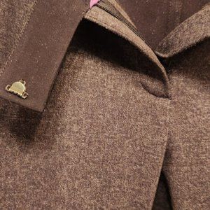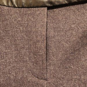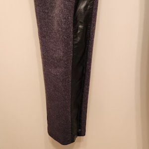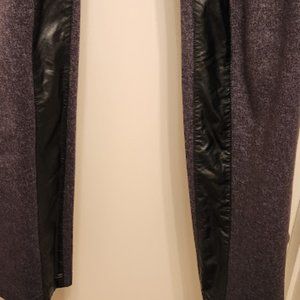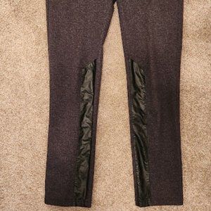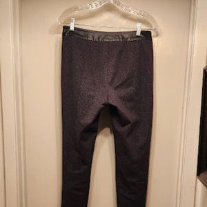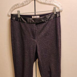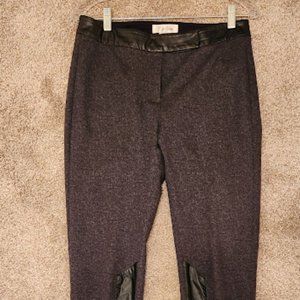 Boutique brand Z by Zelda mixed media trousers help in the fight against boring work pants. Dark grey heather slim leg trousers have something extra with black vinyl trim at the waist and along the inside calf. Medium-weight fabric holds it's shape but stretches for comfort. Medium rise sits just below waist.