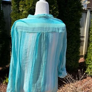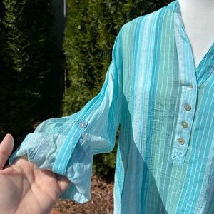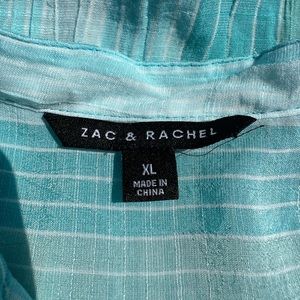 Great beach colors in blues and greens, tunic top by Zac & Rachel in size XL. 65% Polyester and 35% Rayon, lightweight and flowey. Approximate measurements: armpit to armpit: 24 inches, length: 30 inches. (Aisle 5)