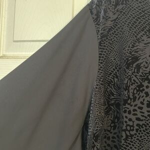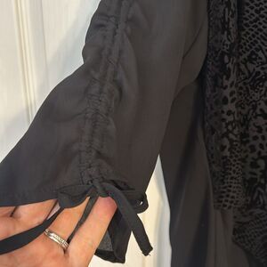 Size 2X Zac & Rachel Woman black mixed media 3/4 sleeve blouse. Velvet burnout front. 3/4 length sleeves with tie at cuffs.