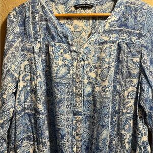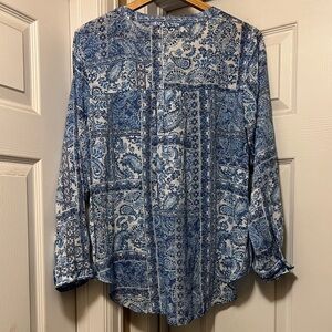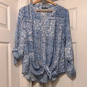 EUC!! Prettiest shades of blue! Multi patterns, tabbed sleeves, front tie. Super feminine and boho. Size tag removed but fits like 1X.