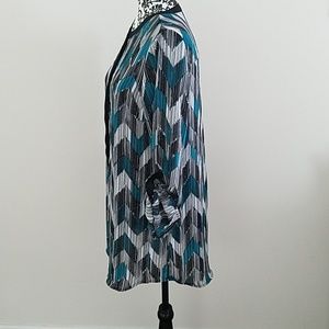 Chevron, black, teal, white, 3/4 sleeves with rolled button tab cuff, concealed buttons on front.
