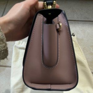 Worn once. Almost new condition. Leather construction. Shiny gold hardware. Fold-over flap with turn-lock closure. One top handle. One interior slip pocket. One exterior slip pocket. Removeable cross-body strap. Burlwood is a muted mauve color that is super pretty.