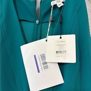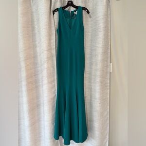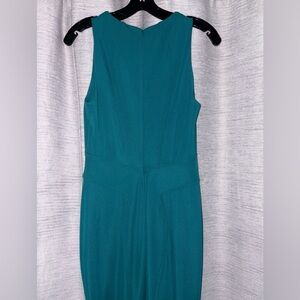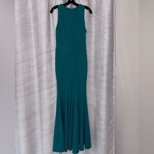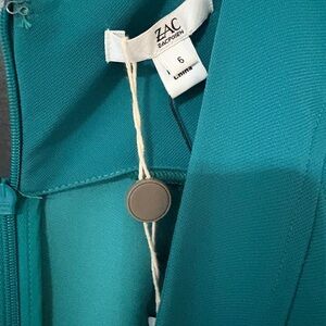 This exquisite gown by ZAC Zac Posen features a striking emerald green/teal hue, perfect for making a statement at weddings, proms, or cocktail events. The sleeveless design and v-neckline add a touch of elegance, while the maxi length and sleek silhouette ensure a sophisticated look. Crafted with a minimalist approach, this dress offers a timeless style that exudes grace and charm.