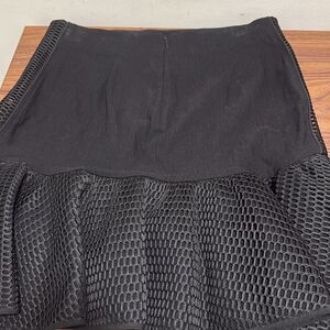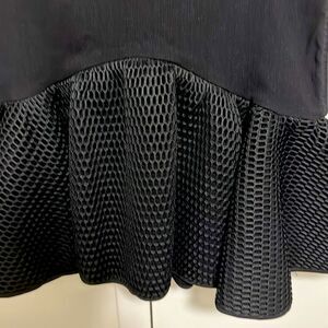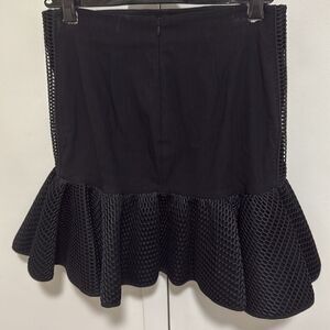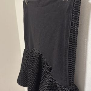 ZAC Posen woman’s black fit & flair mini skirt. Features flat elastic waistband, back zipper, deep ruffle hem, mesh overlay on hem ruffle and down both sides of skirt.