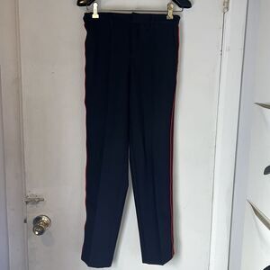 Black polyester, viscose and elastane blend for a dressy look with red stripe detail down the side of each leg, 2 back slit pockets with black buttons, elastic waistband with belt loops, hidden zip and button fly, side pocket at each hip, tapered leg. Washable. Excellent condition. Size 34, measures 13.5” across waistband, 10” rise and 29” inseam.