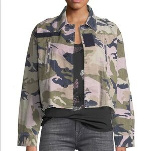 Cool camo updated in pastel hues defines a lightweight jacket cut in a cropped fit with a frayed hemline.