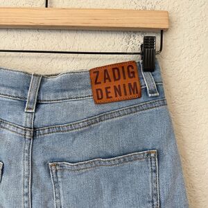 Elevate your wardrobe with this stunning ZADIG & VOLTAIRE denim skirt. The silver trim button-fly design with a raw hem adds a touch of edgy style to your outfit. Perfect for any occasion, whether it's a casual day out or a party, this A-line skirt in a solid blue color is a must-have. Made from 98% cotton and 2% elastane, this skirt is machine washable and features stretch fabric for ultimate comfort. The size is EU 34, US XS, and it is suitable for regular size types. This skirt is an excellent addition to your wardrobe and can be paired with any top to create a stylish look.