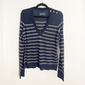 Love this edgy preppy striped sweater with bling buttons! Sparkle metallic silver stripe with blue. Hem is a little distressed and jagged on purpose. Ptp 19”, length 26”. New! Not itchy and quality Merino wool. Treat yourself or a great gift. Questions? Leave a comment below!