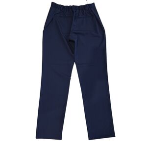Navy blue . 4 button closure. 3 buttons hidden. 2 side pockets. 2 faux back pockets. Navy blue. Straight leg. Elastic on the back waist. Belt loops all around. There is a mark on the button. Hi- Rise.