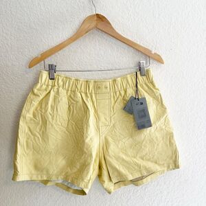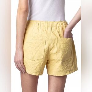 Soft buttery yellow leather. Designed in a purposeful crinkled texture. Rock and Roll vibes! Cute in summer with sandals or wear with tights in the winter. New. Pull on elastic waistband waist 14.5, inseam 3.5, rise 12. Questions? Leave a comment below!