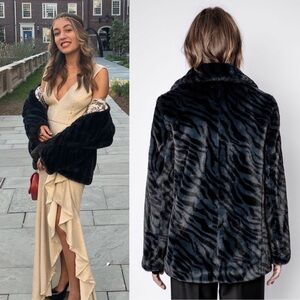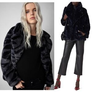 ZADIG & VOLTAIRE Plush Faux Fur Navy Blue Tiger Print Double Breasted Coat S