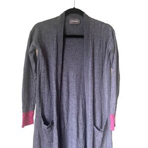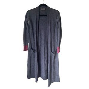 Medium gray/maroon merino wool duster. Slouchy fit. Front pockets. Double hemmed sleeves. Great preloved condition, no flaws. 100% merino wool. Size medium