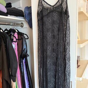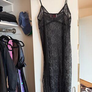jet black sheer lace panelling semi-sheer construction picot trim V-neck adjustable spaghetti straps sleeveless square open back straight hem mid-length
