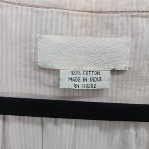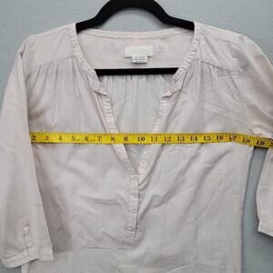 Pale pink boho blouse with 3/4 sleeve and high-low hem. Size XS, pre-owned in good used condition with signs of wear. Photo 7 shows wear, and photo 8 shows a stain on the front of the shirt by the hem area. Not noticeable if you tuck in shirt in your jeans.