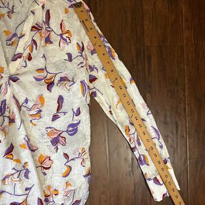 Elevate your wardrobe with this stunning ZADIG & VOLTAIRE Tink Jac Cut Flowers Blouse. The blouse features a lovely V-Neckline with a pullover closure, making it perfect for any occasion, be it travel, party, casual or business. The blouse is crafted from a lightweight and comfortable 56% Viscose and 44% Silk fabric, adorned with a colorful floral pattern and accented with ruffles on the sleeves, adding a bohemian touch to the overall design. This blouse is perfect for all seasons, making it a versatile addition to your wardrobe. It has a relaxed fit, classic/fitted long sleeves, and is machine washable, making it easy to maintain. Add this blouse to your collection today and enjoy the comfort and style it brings.
