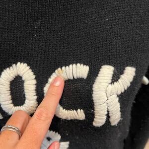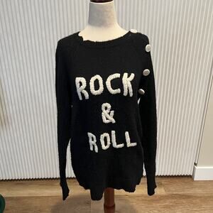Long raglan sleeves. "Rock & Roll" intarsia at front.