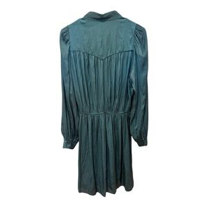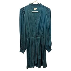 Blue-green mini dress. Long sleeves. Faux-wrap style with button closure at neckline. V-neck. Elastic waistband.