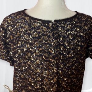 GOLD/ SILVER (SOMEWHAT LEOPARD) MATTE SEQUINED SILK BLEND BLOUSE WITH ZIPPER AND CLASP CLOSURE. EYELASH FRINGE TRIM ON NECKLINE, HEM AND SLEEVE CUFFS.