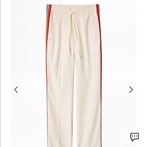 76% acetate 21% viscose 3% elastin with pockets in drawstring waist with colorful stripes going down each side.