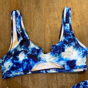 STYLE: Super cute Zaful bikini set, blue and white tie dye, high waisted bottoms, u shape detail on bikini top and open cutout, has padding (can be removed)