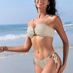 The Bandeau bikini set features with metal u wired bikinitop and high cut cheeky tie sides bottom, so it makes you look more charming and sexier, perfectly show off your curve