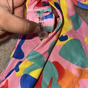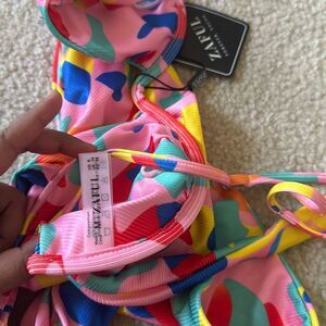 Vibrant bikini set with abstract patterns. Features pink, blue, orange, and yellow colors.
