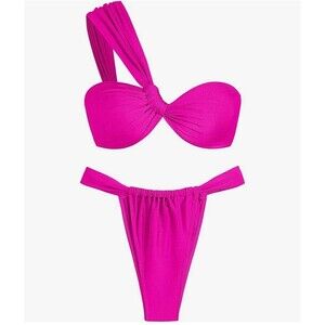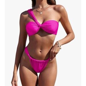 ZAFUL Womens One Shoulder Bikini Twisted Rushed High Cut Bandeau Bikini Set S