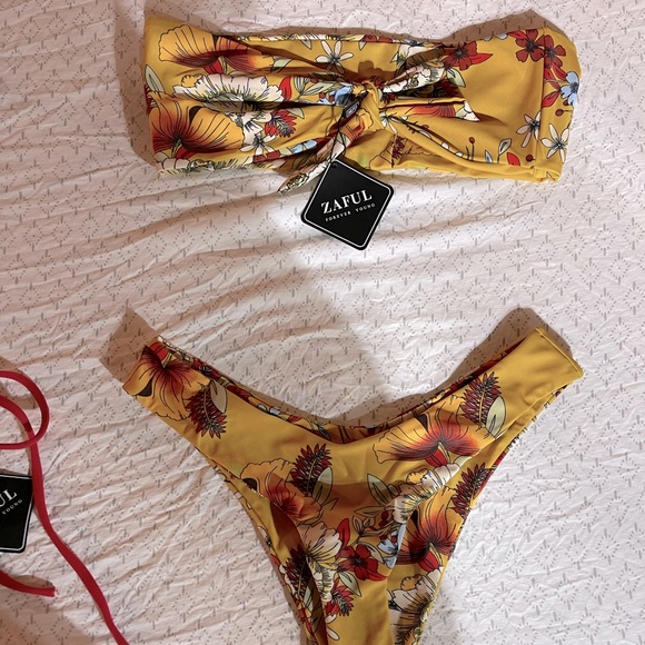 Yellow and floral bandeau bikini. Size medium. Tags still on.