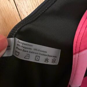 Chic black swimsuit with pink floral pattern. Features bandeau top and matching bottoms.