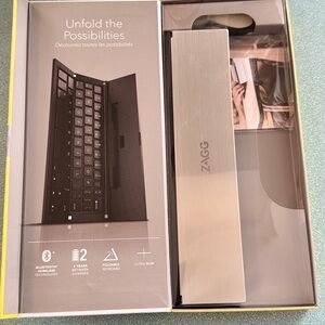 Enhance your productivity with the ZAGG Pocket Wireless Keyboard. This sleek black keyboard is designed for seamless connectivity with iOS devices, offering easy portability and a compact design.