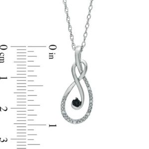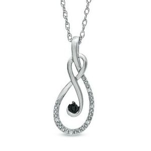 Includes Zales Gift box - Enhanced Black and White Diamond Accent Looping Infinity Pendant in Sterling Silver Includes 18" Sterling Silver chain. Designed to delight, this meaningful pendant carries the message of eternal love. Fashioned in sterling silver, this unique pendant features a clever infinity symbol design, bordered with shimmering white diamond accents along the outer edge. At the center of the style, a single enhanced black diamond in a looping frame completes the look. #8613