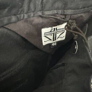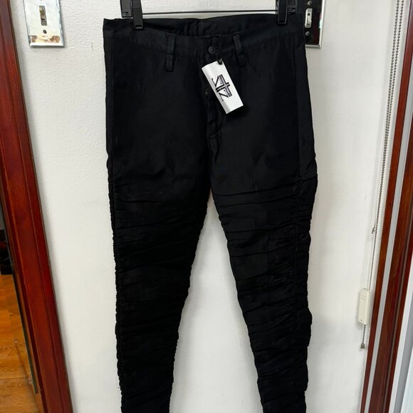 Crazy pair of jeans from ZAM BARRETT - an avant garde niche brand that is now based out of New York I think? They recently moved there factory somewhere. Anyway - this is a hand made garment that features this insane concept for jeans - so they took black pair of pants then sewed a layer of ruched silk over top of it - pockets and all. The reason? The more you wear this pair of jeans, the more breaks and tears in the silk you will get, and the more personalized it will be to your body. I think this is a super cool concept - you even have to cut the pockets open yourself. Incredibly long inseam, ruched sides - what more can you ask.