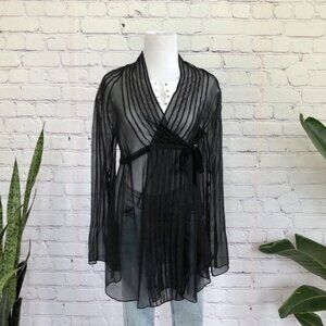 FAMOUS ENGLISH DESIGNER ZANDRA RHODES AT TOPSHOP PURPLE AND BLACK VISCOSE CAFTAN TOP. THIS TOP SLIPS OVER THE HEAD AND TIES AT THE NECKLINE. IT HAS TWO SLITS AT THE ARM. ELASTICIZED WAIST. UK SIZE 10 US 6. WOULD FIT MEDIUM OR LARGE BECAUSE OF THE CAFTAN STYLE. IT HAS ONE MINOR REPAIR AT BOTTOM OF POINT IN FRONT ABOUT 1" WHICH FOLDS INTO THE TOP SO NOT NOTICEABLE AT ALL MENTIONING FOR ACCURACY. SEE LAST TWO PHOTOS OTHERWISE IN GOOD CONDITION!