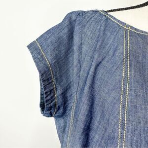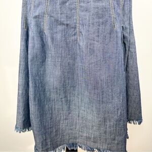 Stitched down pleats. Raw fringe hem. Lightweight cotton chambray. Topstitching is slimming and flattering. Great for steamy hot days or when you want an easy put together look.
