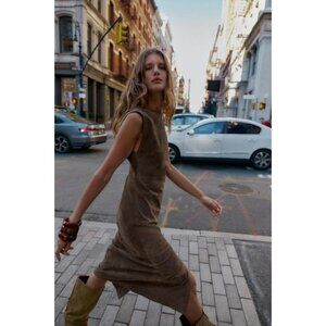 Dress made in 100% leather. Round neck and sleeveless. Hem with front slit. Back zip closure.