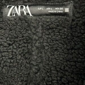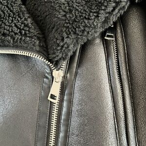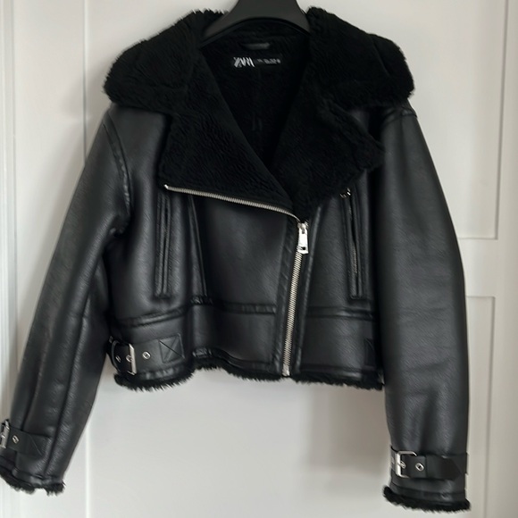 Awesome ZARA faux leather biker jacket with plush cozy lining. Biker jacket details with chunky silver zippers and buckles size Large. Brand new without tags.