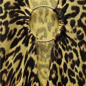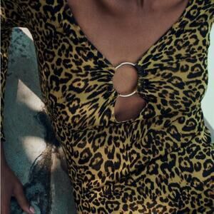 Stylish leopard print dress with long sleeves. Features a chic ring detail at the neckline.