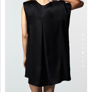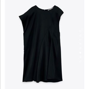 ZARA ASYMMETRICAL SATIN EFFECT DRESS sleeveless dress with round neckline, asymmetrical armscyes, and shoulder pads. Back dart detail and hidden in-seam zip closure. Size Xs NWT Black